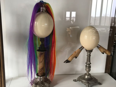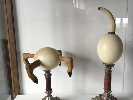 Œufs d’autruches, métal, corne animale, mastic à greffer