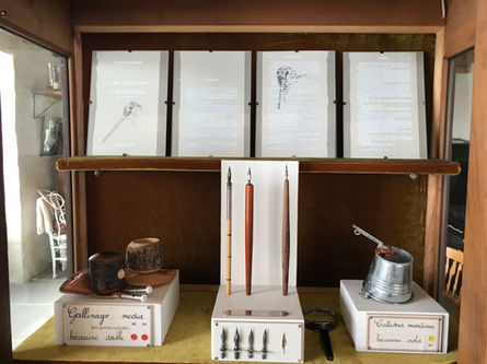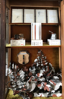 Graphite sur test d’oursin, métal gravé, bois et verre