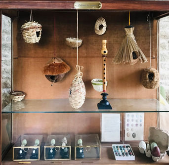 Des appeaux d’oiseaux, greffés à des instruments et ustensiles divers, constituent une collection improbable que les cartels, biffés, raturés rendent encore plus fictive.